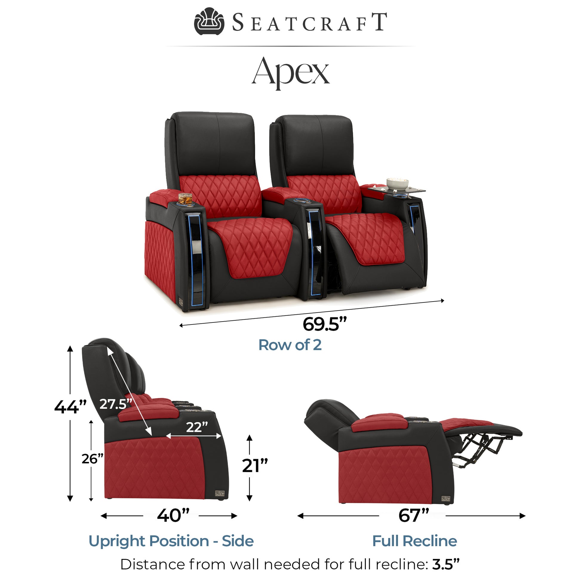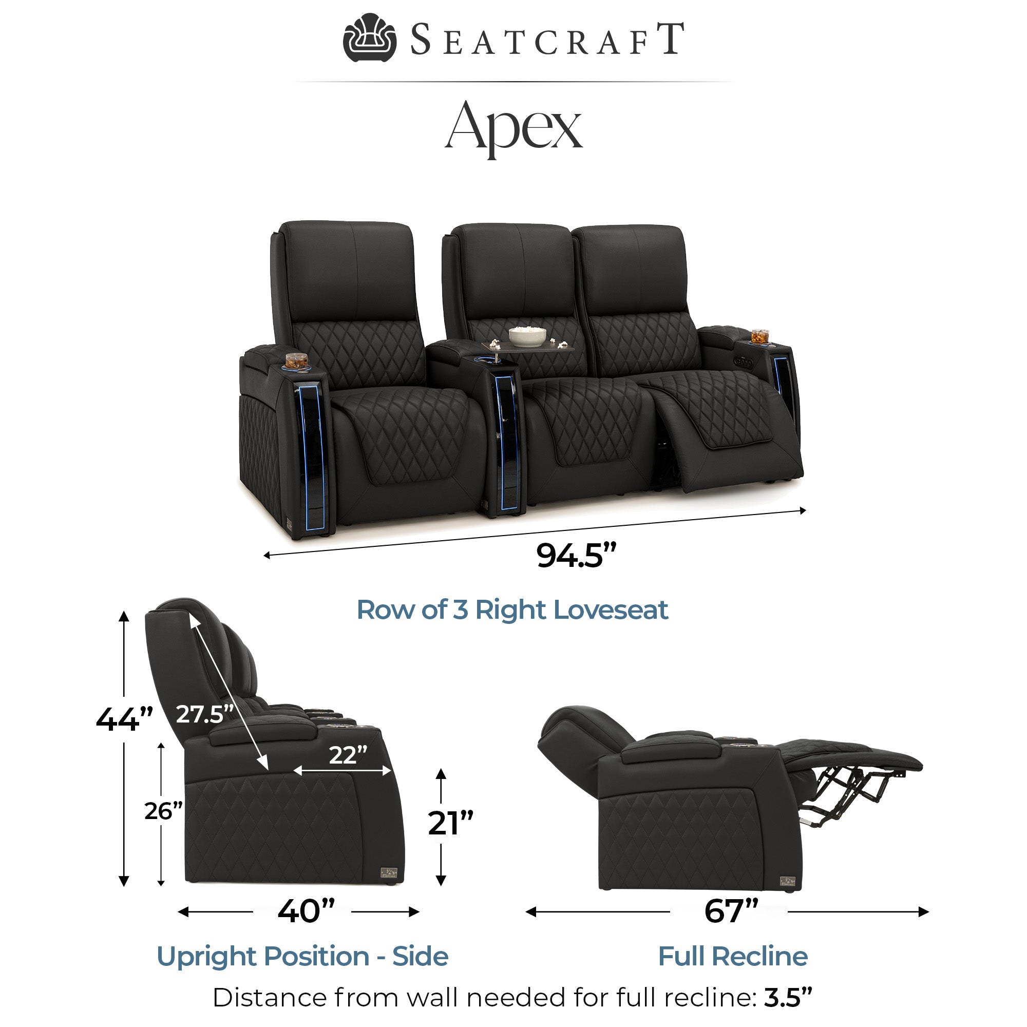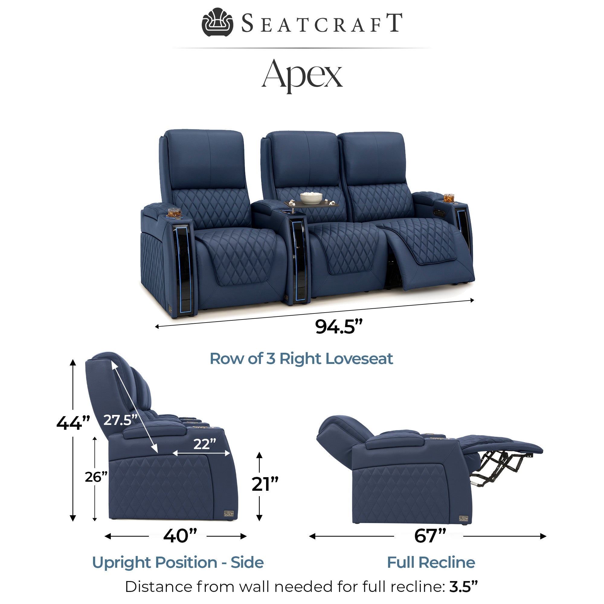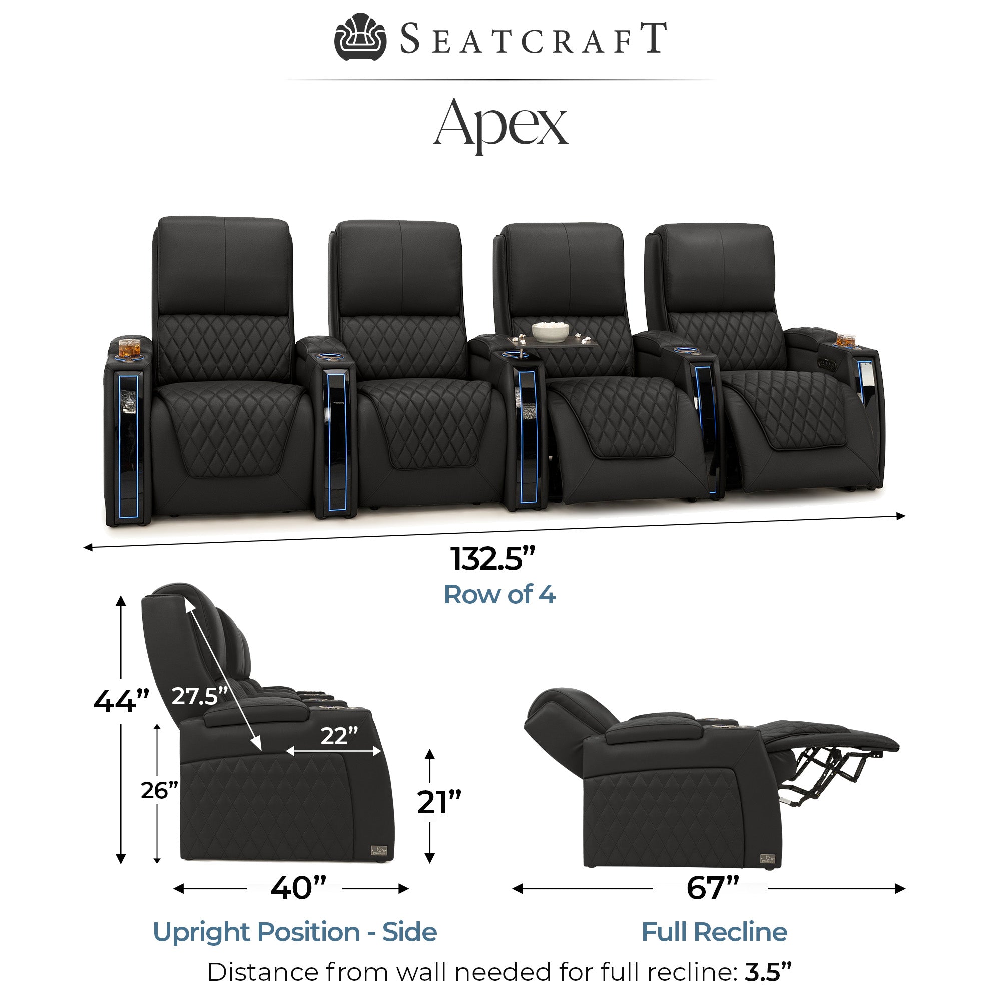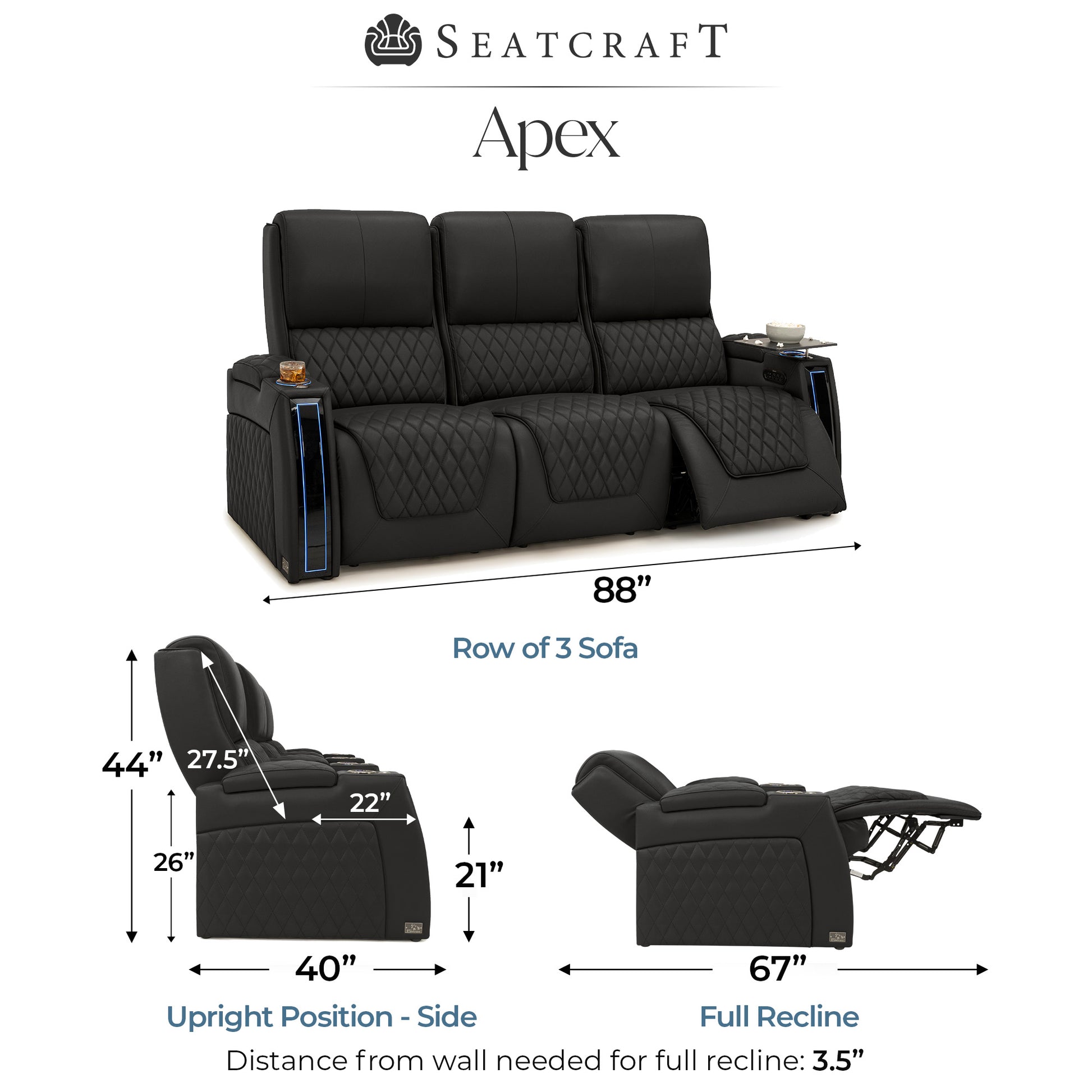 Designed specifically for home theaters and media rooms, not standard living room seating. The proportions, support, and recline angles are engineered to enhance long movie nights and immersive viewing.