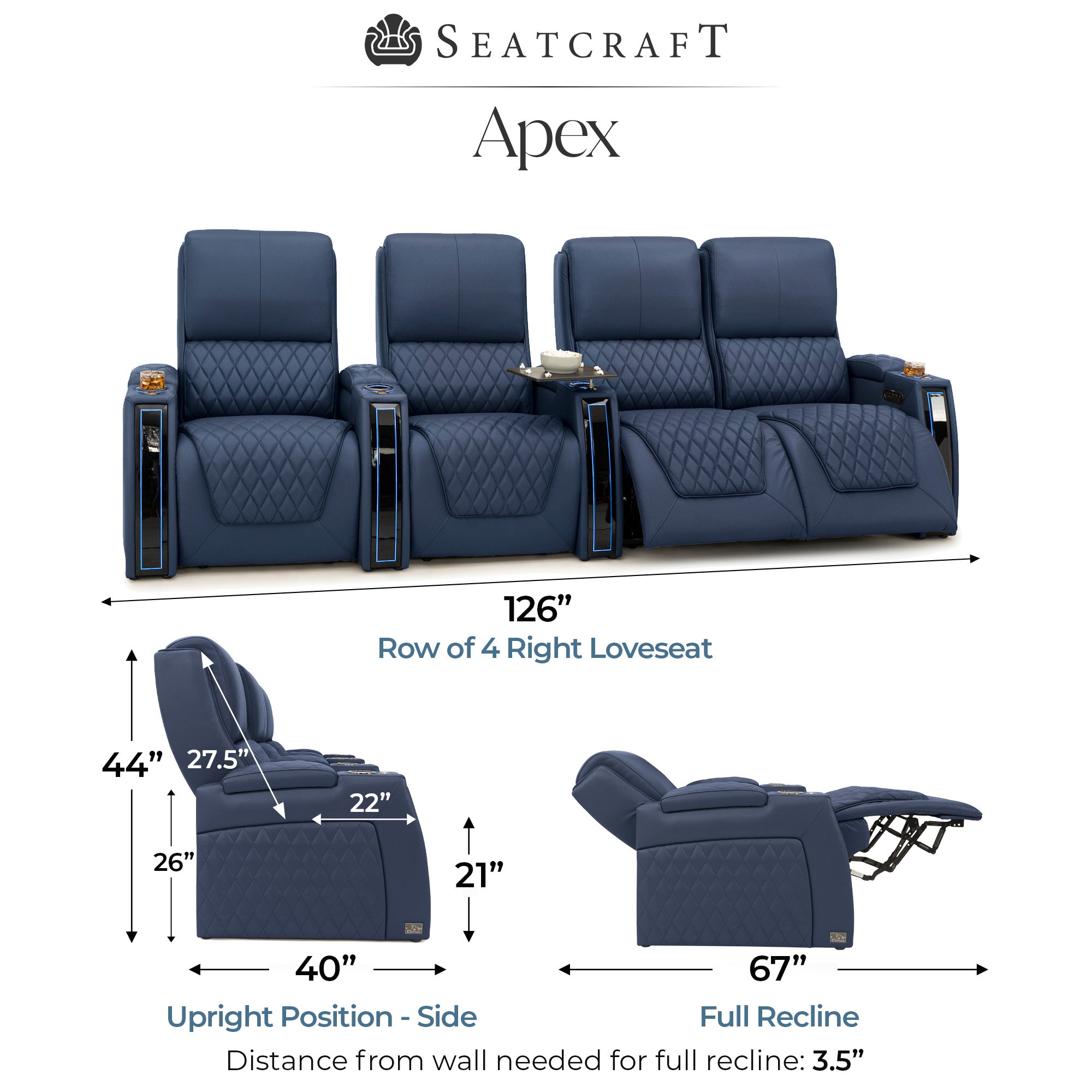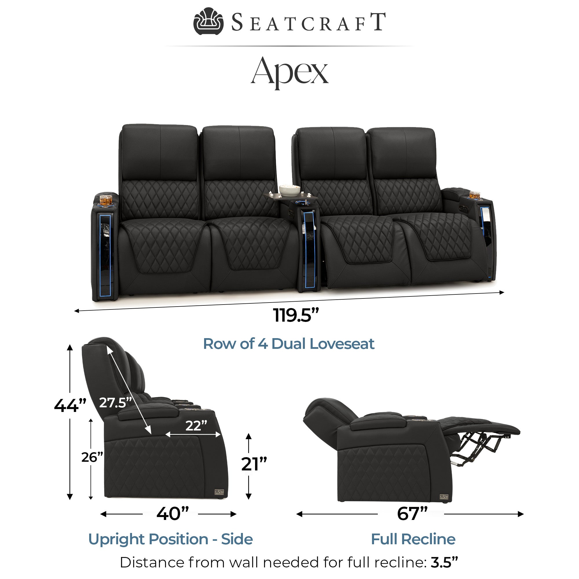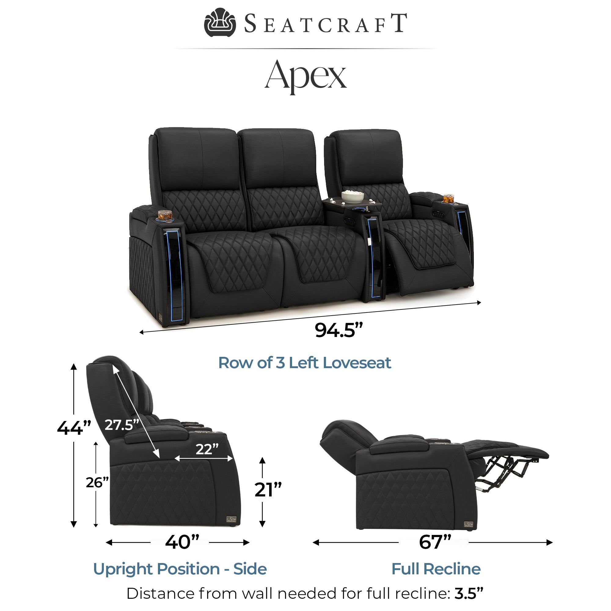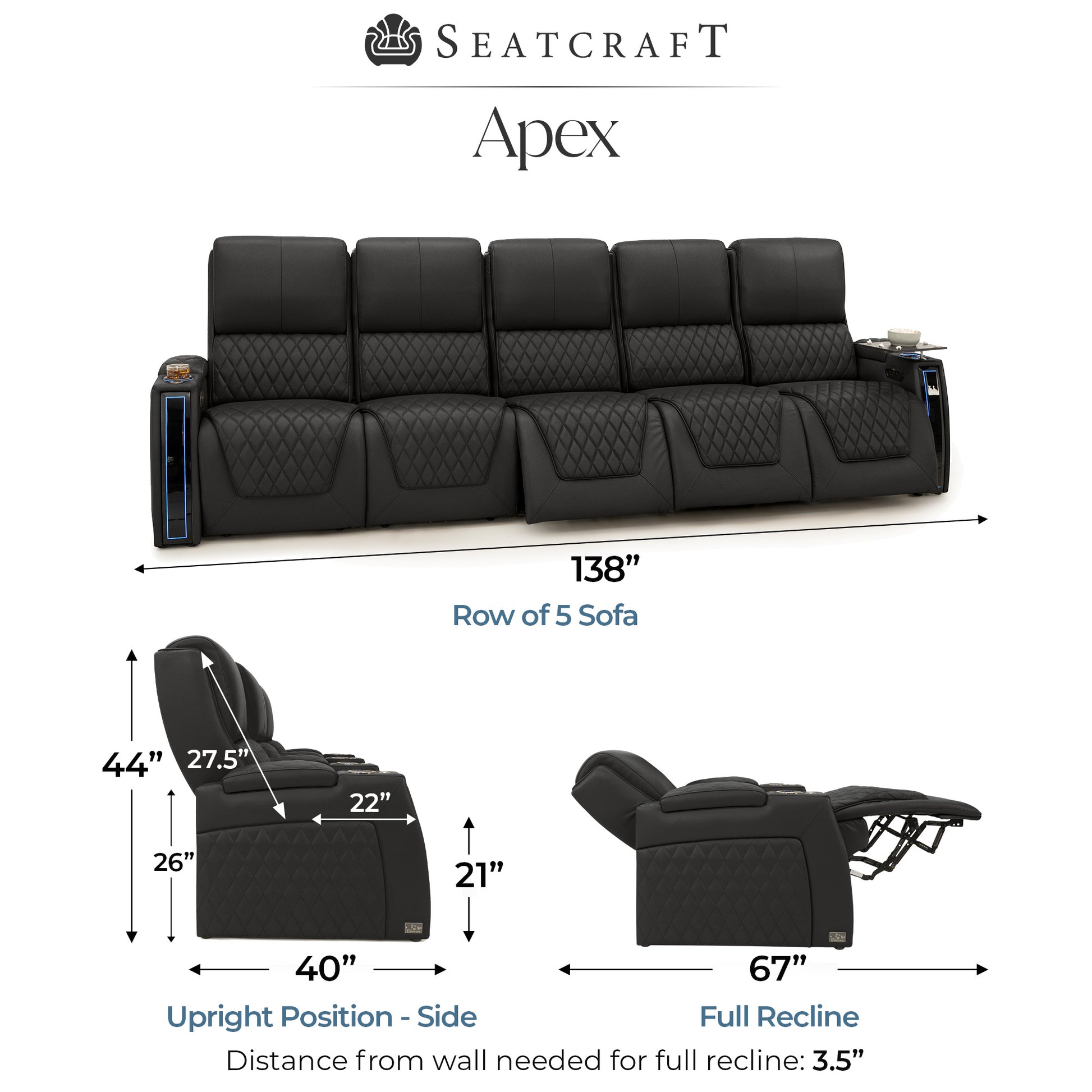 Designed specifically for home theaters and media rooms, not standard living room seating. The proportions, support, and recline angles are engineered to enhance long movie nights and immersive viewing.